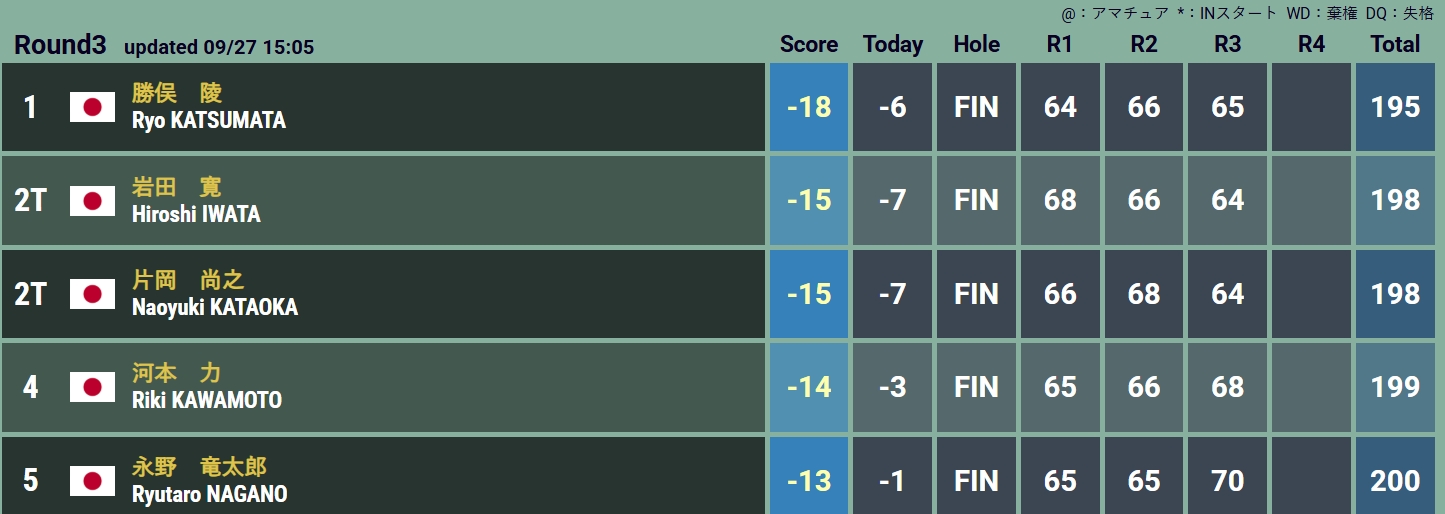 2025年9月27日、パナソニックオープンゴルフチャンピオンシップは3日目を終了。勝俣陵が7バーディ・1ボギーの65で回り、通算−18で単独首位に立ちました。岩田寛と片岡尚之が3打差の−15で追走し、河本力(−14)、永野竜太郎(−13)も優勝圏内。最終日は混戦模様の優勝争いに大きな注目が集まります。詳細は【JGTO】【大会公式サイト】をご確認ください。