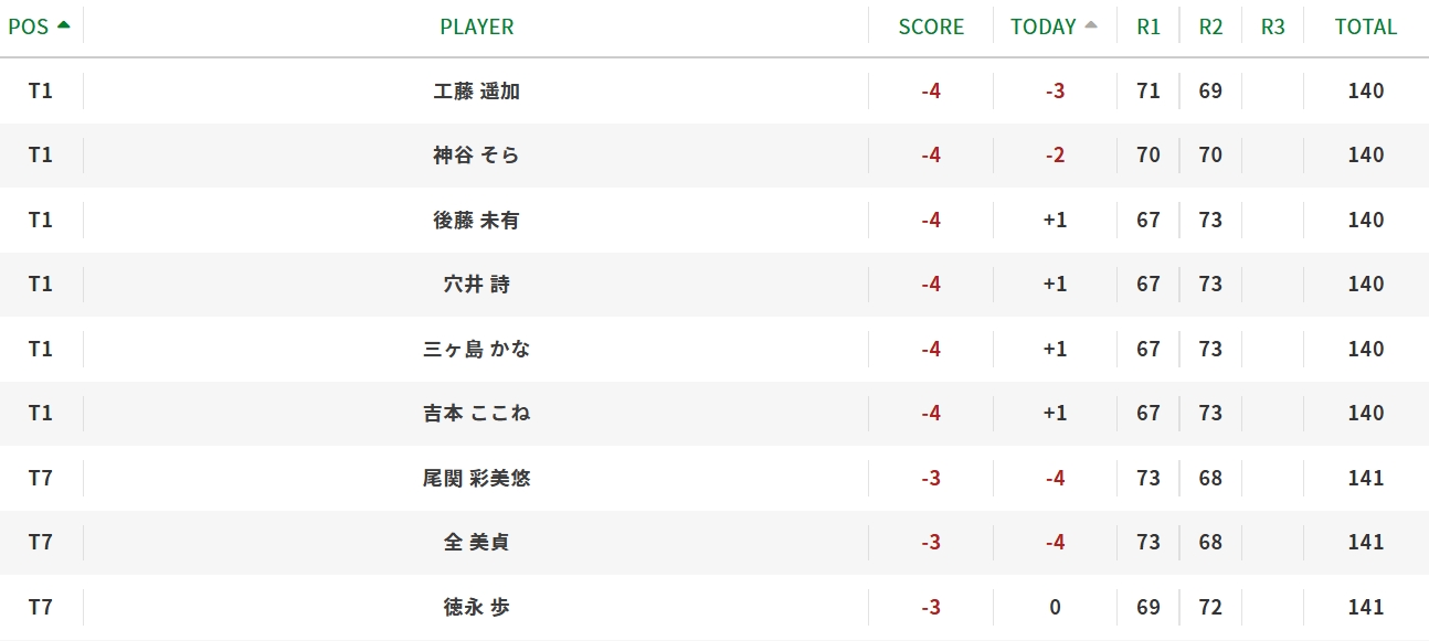 初日首位の選手がスコアを伸ばしきれない中、工藤と神谷が安定したプレーで首位グループに加わり、計6人が並ぶ展開になりました。