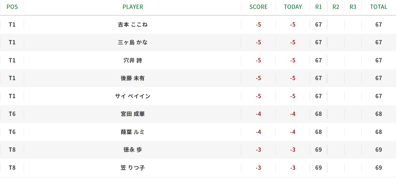 • 三ヶ島かな:報道によればバーディを量産する積極的なプレーで67をマーク。パッティングのテンポが良く、ショットとの噛み合わせが好調だったとされています。