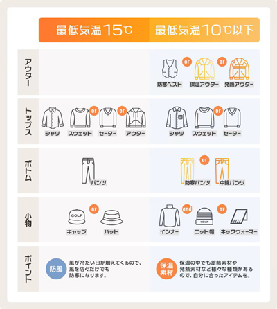 | インナー | 保温・汗冷え防止 | 吸湿発熱素材・速乾性 |
