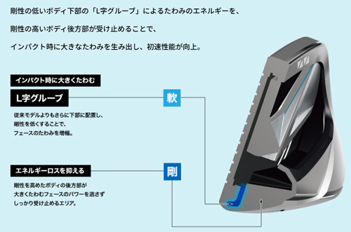 フェース裏側の低剛性ゾーンが大きくたわみ、そのエネルギーを高剛性部が受け止めて押し返す――